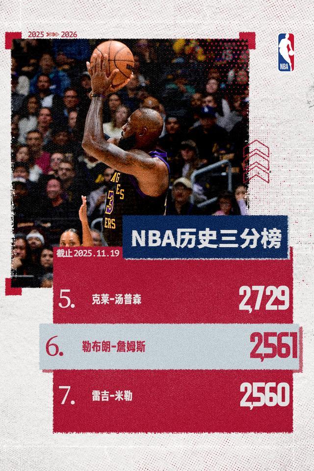在比赛第二节,詹姆斯急停跳投三分命中,生涯三分命中数达到2561,超越雷吉-米勒,升至历史第六位。